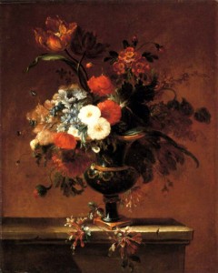 Carnations, peonies, narcissi and other flowers in an urn on a ledge